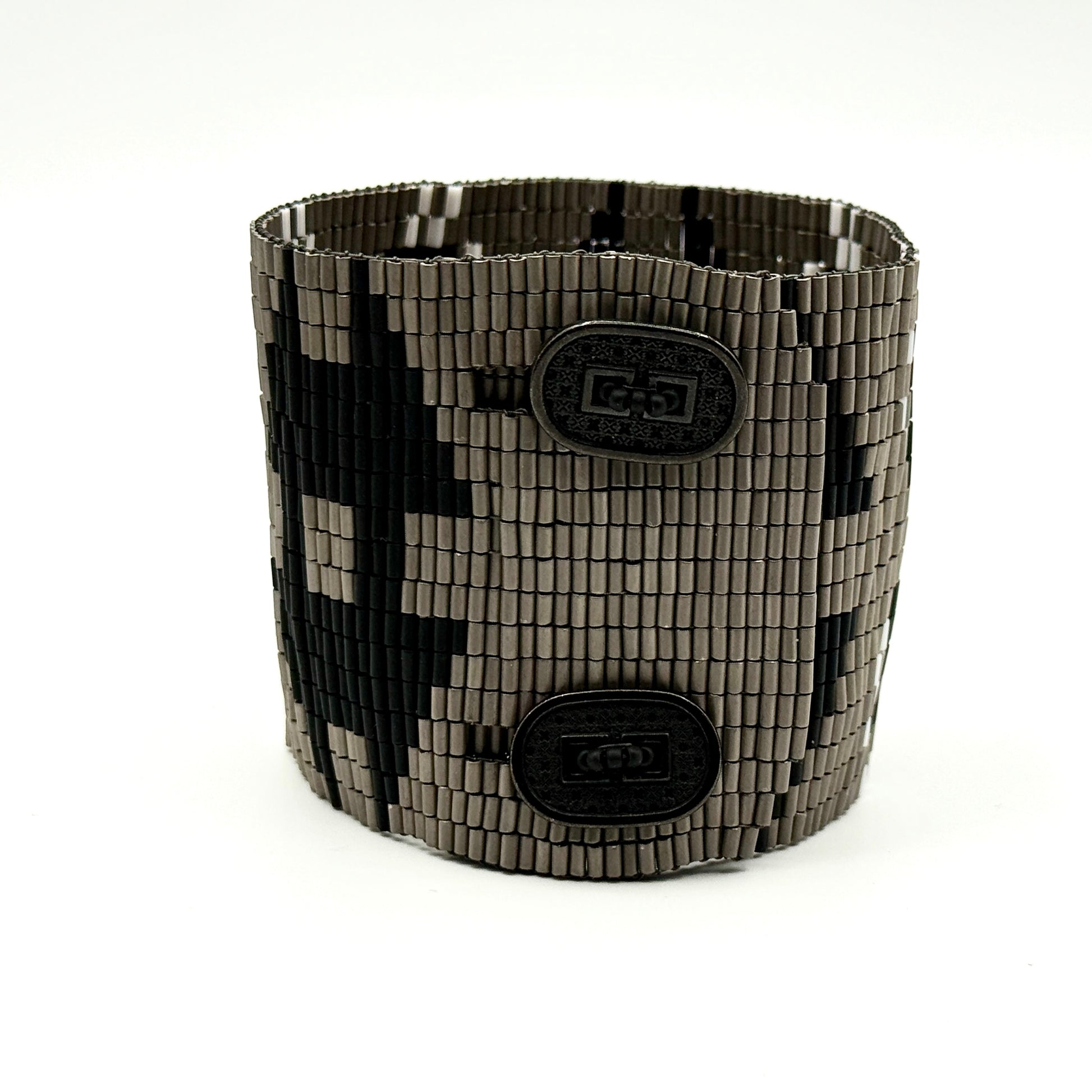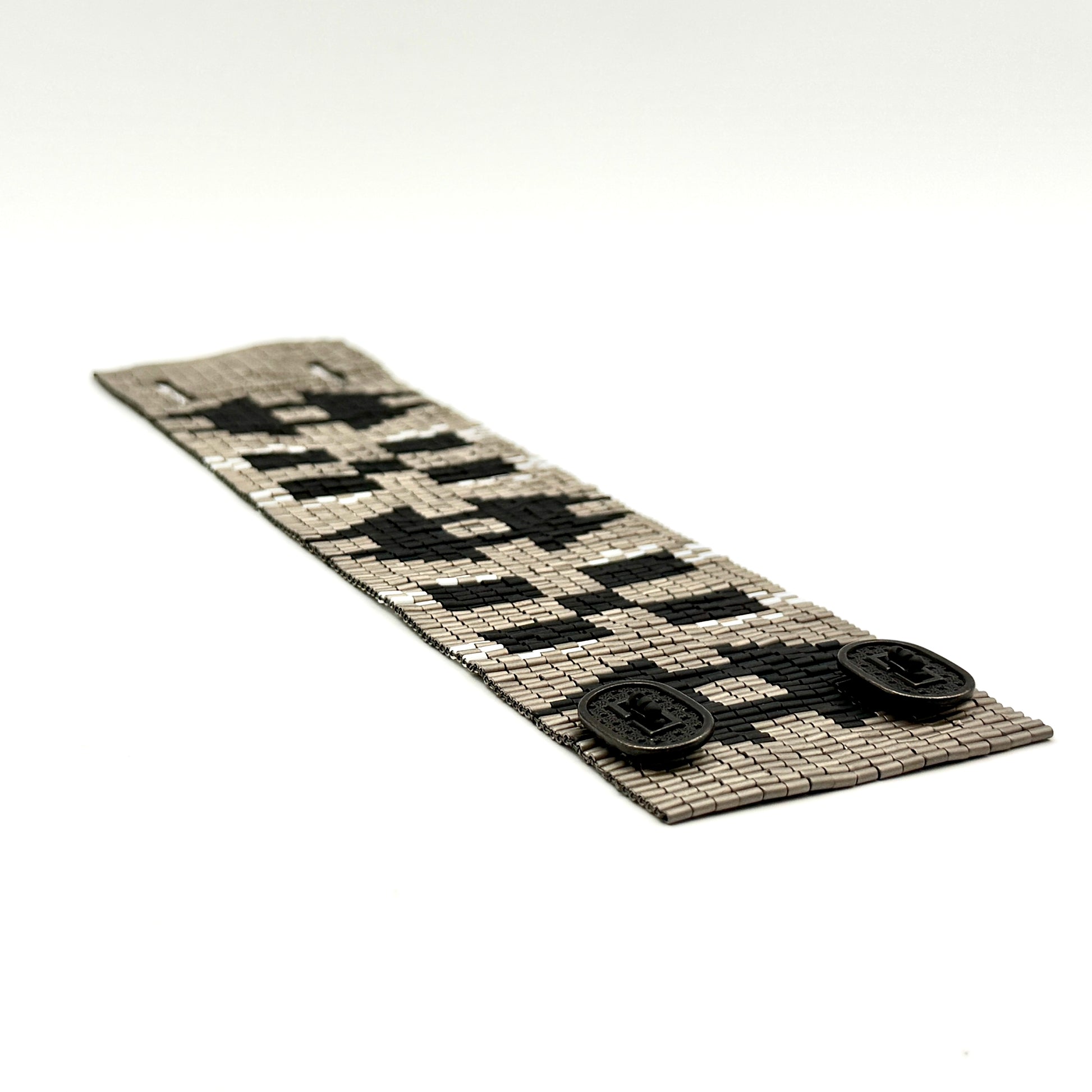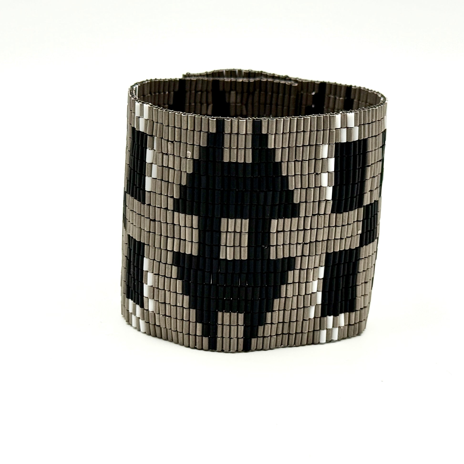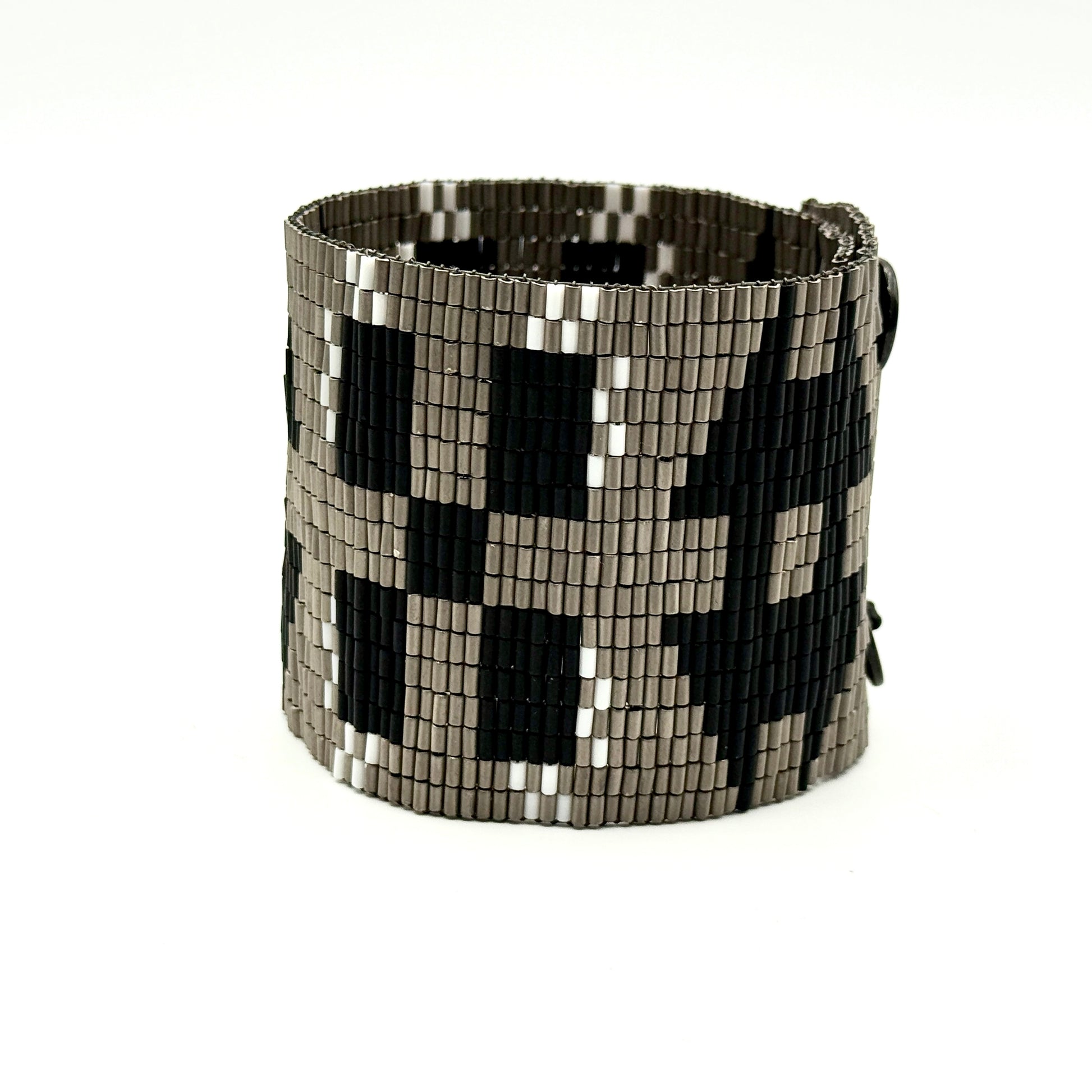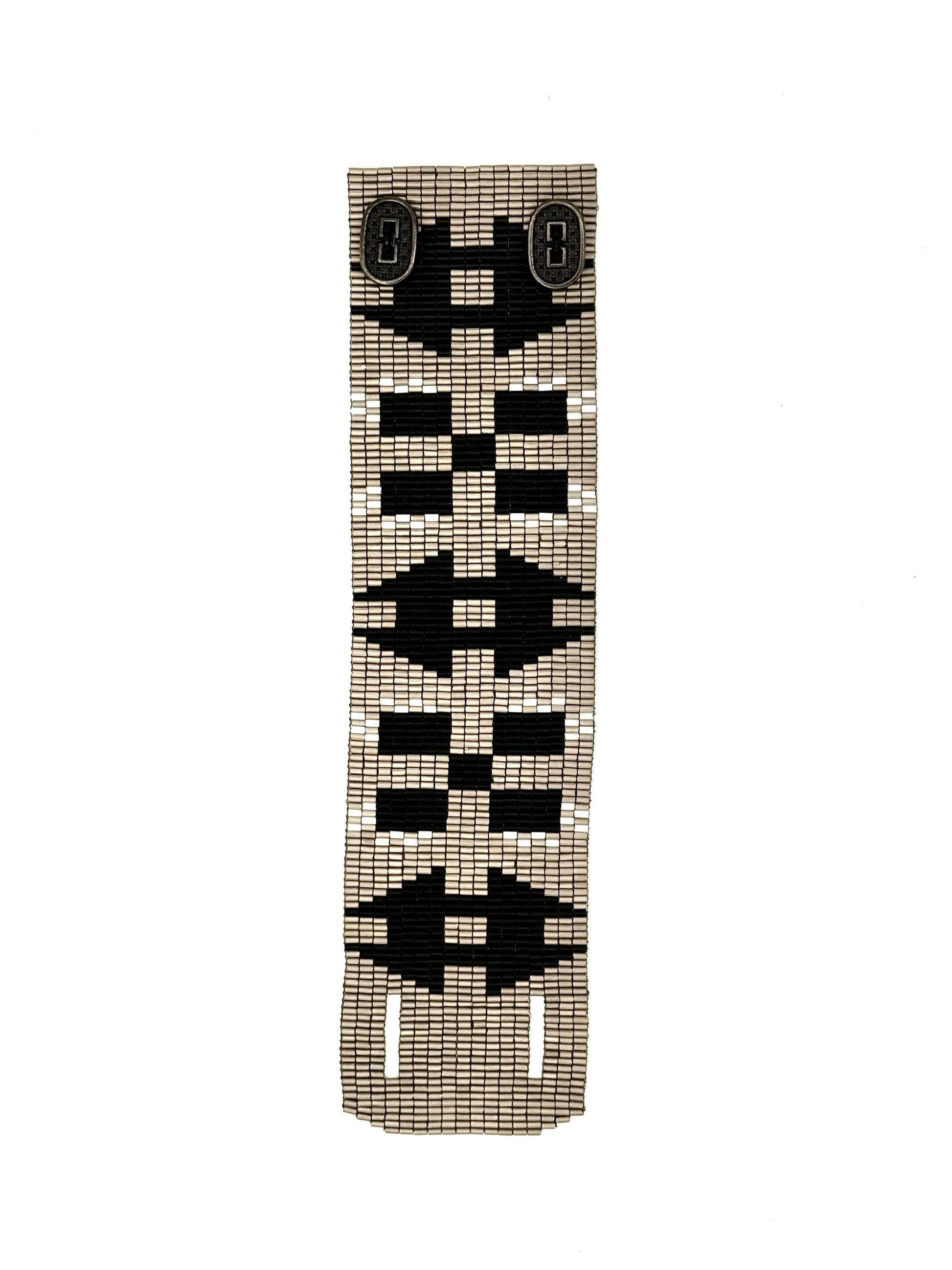 Rooted in the coded language of quilts that marked safe passage along the Underground Railroad, this loomed bracelet weaves together historical significance and artisanal craft. Fashioned from glass bugle beads, it features two powerful symbols—the monkey wrench and the bear's paw—each carrying layers of meaning from a pivotal chapter in American history. A wearable tribute to resilience and hidden messages of hope.